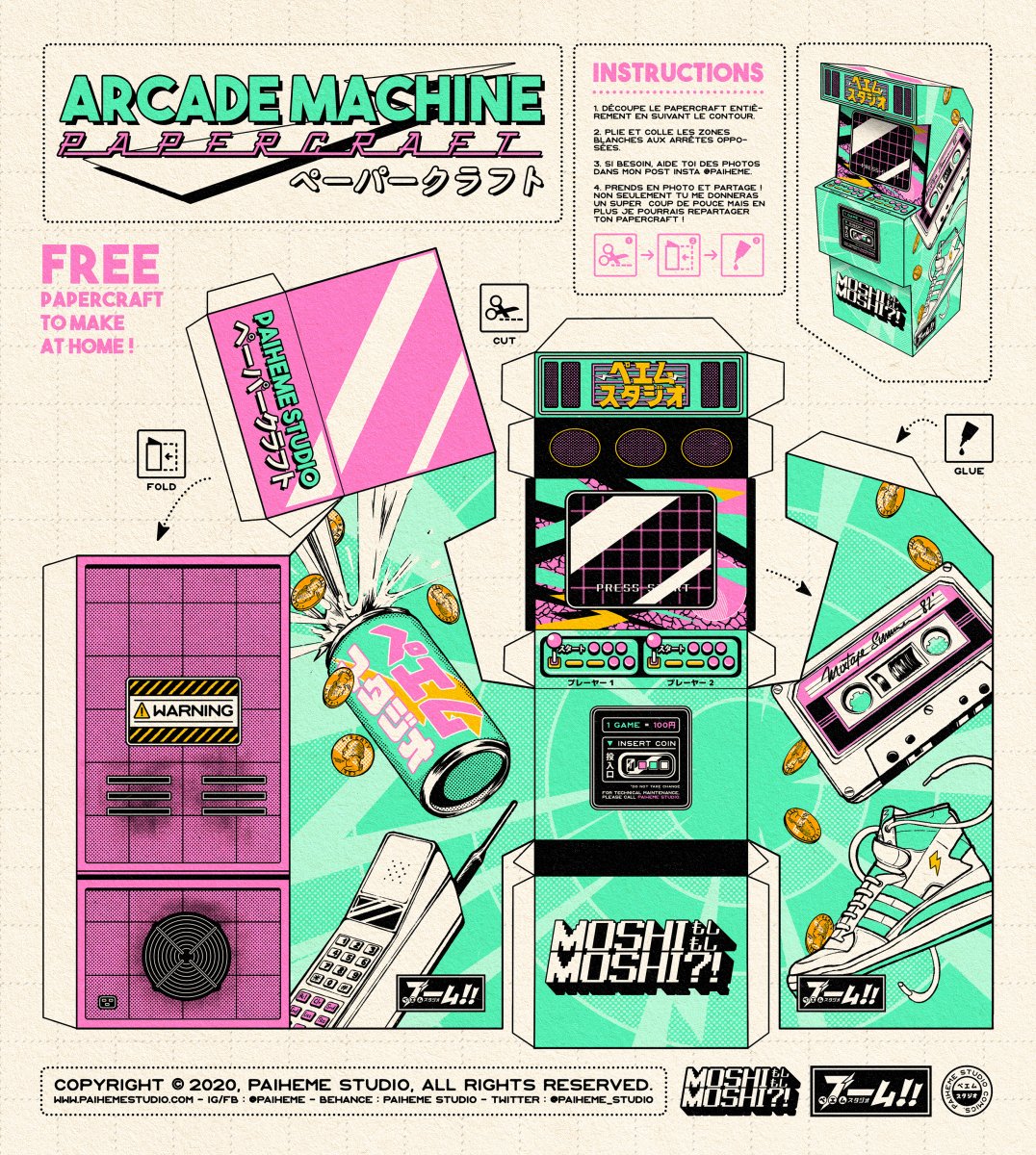 MOSHIMOSHI?! ARCADE MACHINE PAPERCRAFT is a project by Paiheme Studio, a shop dedicated to create and sell vintage Japanese comics. The studio created this project for people that are bored during isolation for the current coronavirus situation. This project gives the possibility for everyone to have one of this artist's works at home from free. The project can be connected to both, digital - in how it is distributed in the world - and print - because you end up with a printed piece.