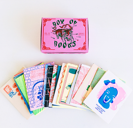 THE BOX OF BOOKS VOL. IX 2016 consists in a collection of zines created by various artists, put together in a box to sell at the 2016 edition of the LA book fair. This piece was created by Los Angeles/berkeley-based collective publishing press Tiny Splendor and curator Darin Klein and friends in collaboration with twenty different and very talented artists, with 2-color screenprint on pink pastry boxes by Kenneth Srivijittakar. The concept was the distribution of these publications that are totally unrelated to each other, in a box to support these individual artists.